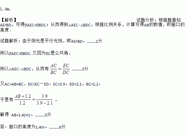 如图,阳光通过窗口照到教室内,竖直窗框在地面上留下2.1 m长的影子如图所示,已知窗框的影子DE的点E到窗下墙脚的距离CE=3.9 m,窗口底边离地面的距离BC=1.2 m,试求窗口的高度(即AB的值).