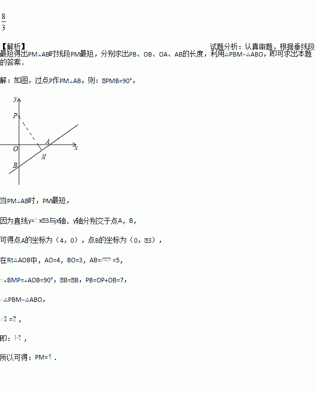 如图,在平面直角坐标系中,点P的坐标为(0,4),直线y=x-3与x轴、y轴分别交于点A、B,点M是直线AB上的一个动点,则PM的最小值为________.