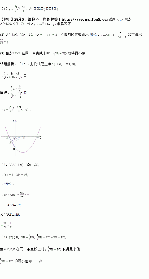 分别交x轴于点A(-1,0),C(3,0),交y轴于点B,抛物线的对称轴与x轴相交于点D. 点P为线段OB上的点,点E为线段AB上的点,且PE⊥AB.