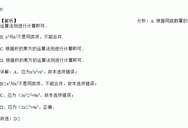 A. x2x3=x6 B. x3+x2=x5 C. (3x3)2=9x5 D. (2x)2=4x2