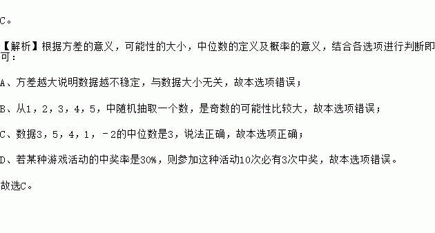 C.数据3,5,4,1,﹣2的中位数是3