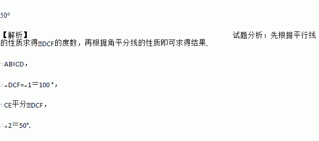 如图,AB∥CD,AF分别交AB、CD于A、C,CE平分∠D CF,∠1=100 °,则∠2=_____.