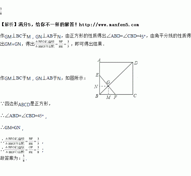 如图,点、分别在正方形的边、上,与对角线交于点,如果,,那么的比值是________.