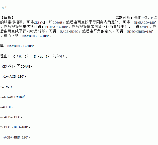 如图,平面直角坐标系中,C(0,5)、D(a,5)(a>0),A、B在x轴上,∠1=∠D,请写出∠ACB和∠BED数量关系以及证明.