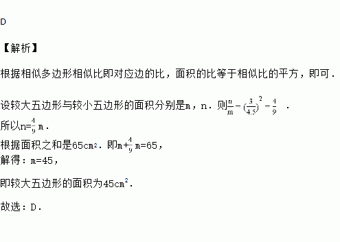 如果两个相似五边形的面积和等于65 cm2,其中一组对应边的长分别为3 cm和4.5 cm,那么较大五边形的面积为( )