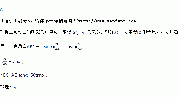 如图,为测楼房的高,在距楼房50米的处,测得楼顶的仰角为,则楼房的高为( )