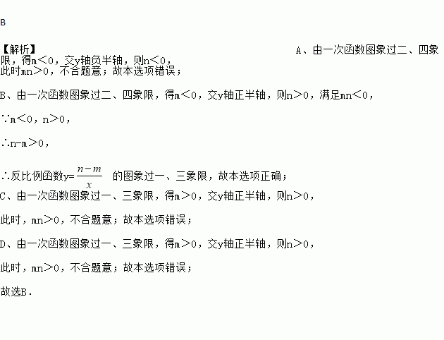 已知一次函数y=mx+n与反比例函数y=其中m、n为常数,且mn<0,则它们在同一坐标系中的图象可能是( )