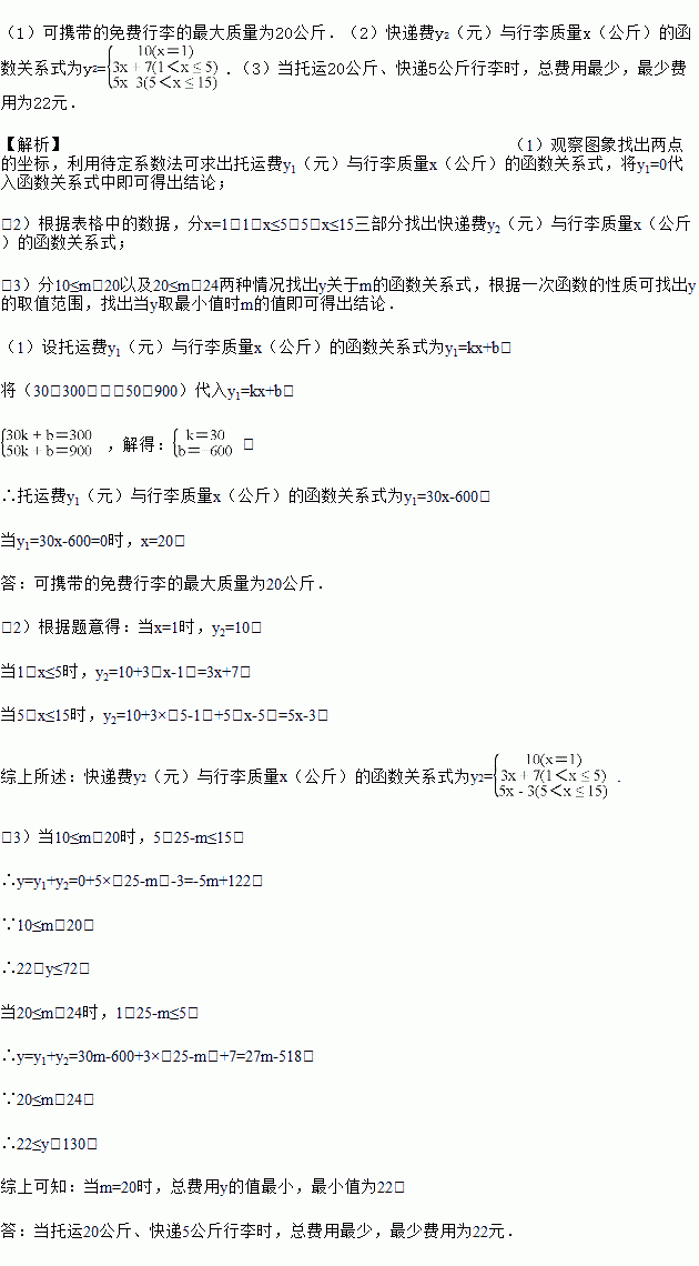(3) 某旅客携带25kg的行李,设托运m kg行李(10≤m<24,m为正整数),剩下的行李选择快递.当m为何值时,总费用y的值最小?并求出其最小值是多少元?
