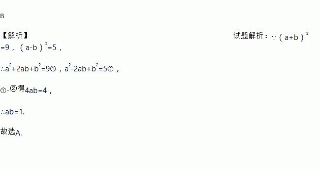 B 【解析】试题解析:∵(a+b)2=9,(a-b)2=5, ∴a2+2ab+b2=9①,a2-2ab+b2=5②, ①-②得4ab=4, ∴ab=1. 故选A.