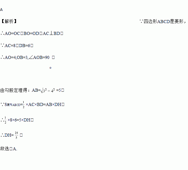 如图,四边形ABCD是菱形,AC=8,DB=6,DH⊥AB于H,则DH等于( )