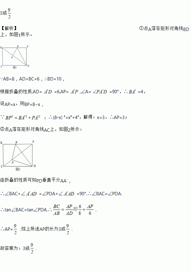 在矩形ABCD中 ,AB=8 , BC=6, 点P在边AB上。若将△DAP沿DP折叠 ,使点A落在矩形对角线上的点A,处,则AP的长为__________。