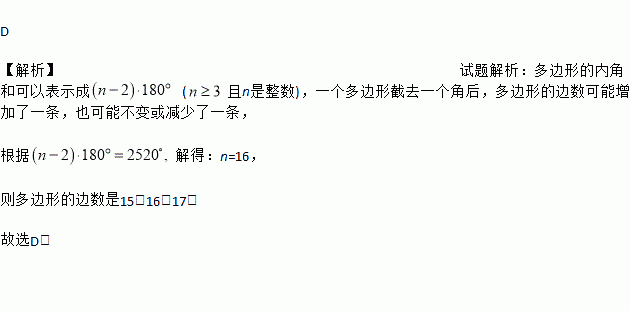 一个多边形截去一个角后,形成另一个多边形的内角和为2520°,则原多边形的边数是( )