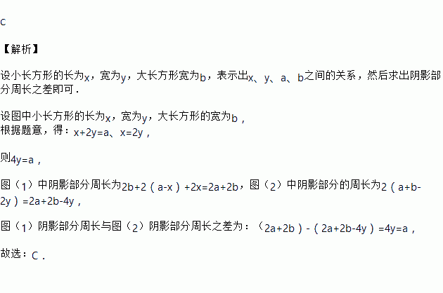 两个完全相同的大长方形,长为a,各放入四个完全一样的小长方形后,得到图(1)、图(2),那么图(1)阴影部分的周长与图(2)阴影部分的周长的差是( )(用含a的代数式表示)