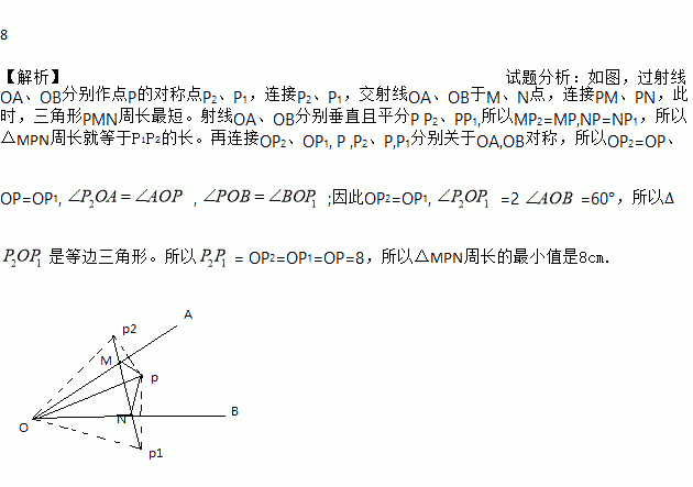 Èçͼ£¬µãPÊÇ¡ÏAOBÄÚ²¿µÄÒ»µã£¬¡ÏAOB£½30¡ã£¬OP£½8 cm£¬M£¬NÊÇOA£¬OBÉϵÄÁ½¸ö¶¯µã£¬Ôò¡÷MPNÖܳ¤µÄ×îСֵ_____cm.