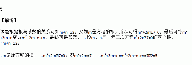 设m,n是一元二次方程x2+2x-7=0的两个根,则m2+3m+n=_______.