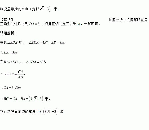 济南市地铁R3线施工,某路口设立了交通路况显示牌(如图).已知立杆AB的高度是3m,从侧面D点测得显示牌顶端C点和底端B点的仰角分别是60°和45°.求路况显示牌的高度BC.