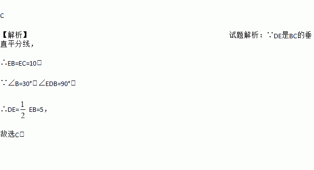C 【解析】试题解析:∵DE是BC的垂直平分线, ∴EB=EC=10, ∵∠B=30°,∠EDB=90°, ∴DE=EB=5, 故选C.