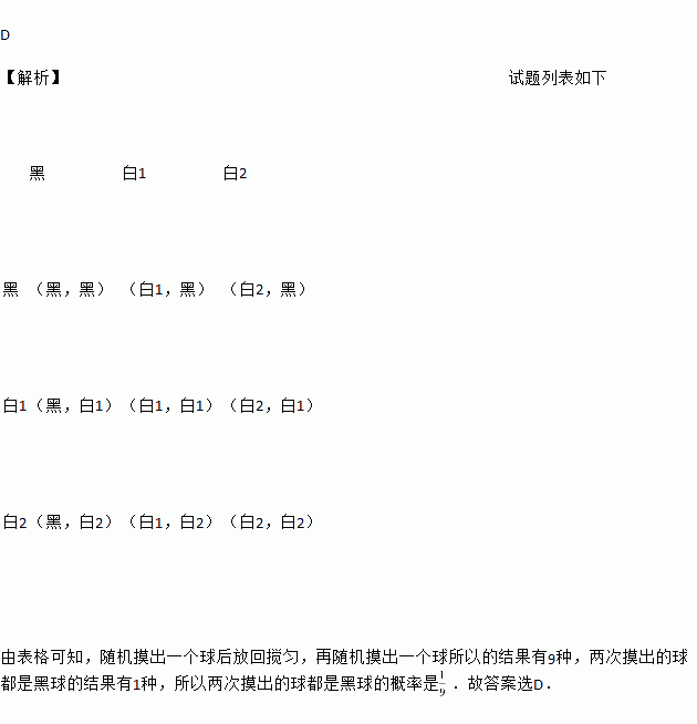 一个布袋内只装有1个黑球和2个白球,这些球除颜色不同外其余都相同,随机摸出一个球后放回搅匀,再随机摸出一个球,则两次摸出的球都是黑球的概率是( )