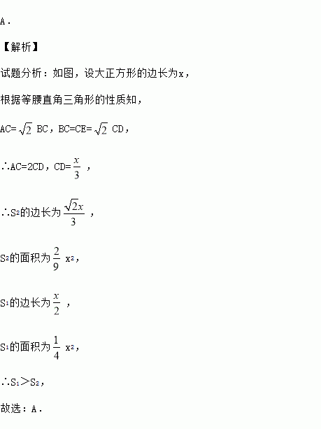 如图,大正方形中有2个小正方形,如果它们面积分别是S1、S2 ,那么S1、S2的大小关系是 ( )