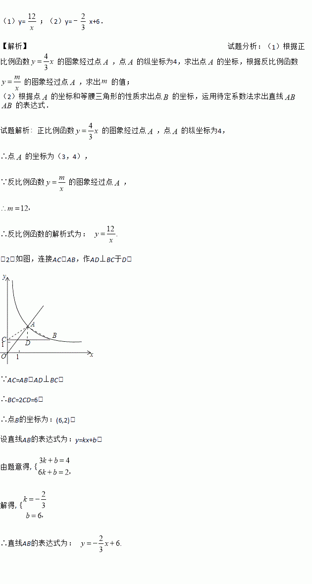 (1)y= ;(2)y=﹣x+6. 【解析】试题分析:(1)根据正比例函数的图象经过点,点的纵坐标为4,求出点的坐标,根据反比例函数的图象经过点,求出的值; (2)根据点的坐标和等腰三角形的性质求出点的坐标,运用待定系数法求出直线 的表达式. 试题解析 正比例函数的图象经过点,点的纵坐标为4, ∴点的坐标为(3,4), ∵反比例函数的图象经过点, ∴反比例函数的解析...