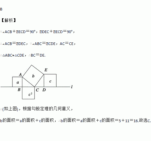 如图,直线l上有三个正方形a,b,c,若a,c的面积分别为5和11,则b的面积为( )