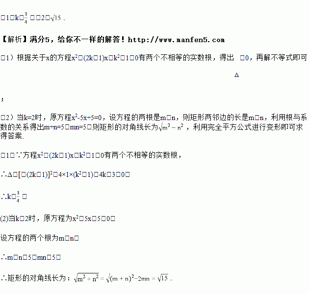(2)若方程的两根恰好是一个矩形两邻边的长,且k=2,求该矩形的对角线L的长.