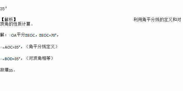 如图,已知直线AB,CD相交于点O,OA平分∠EOC,∠EOC=70°,则∠BOD的度数是_______°