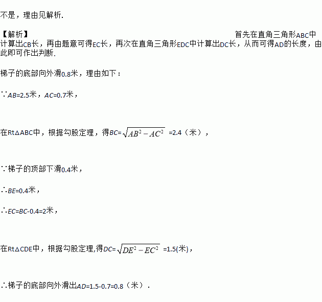 如图,一个工人拿一个2.5米长的梯子,底端A放在距离墙根C点0.7米处,另一头B点靠墙,如果梯子的顶部下滑0.4米,梯子的底部也向外滑0.4米吗,为什么?.