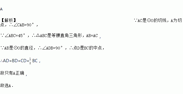 如图AB是⊙O的直径,AC是⊙O的切线,A为切点,连结BC交圆0于点D,连结AD,若∠ABC=45