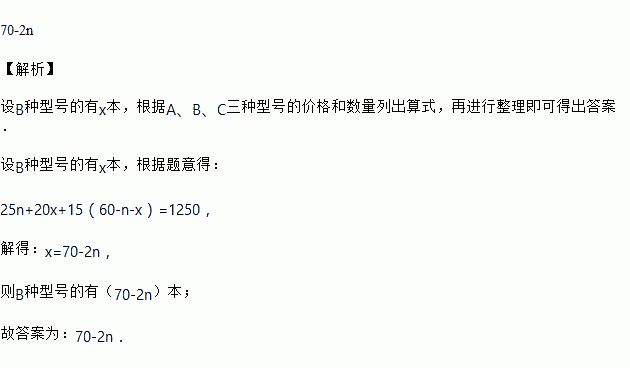 某单位购进A,B,C三种型号的笔记本60本,它们的单价分别是25元、20元和15元,共计花费1 250元.若其中有A种型号的笔记本n本,则B种型号的有______本.(结果用含n的代数式表示)