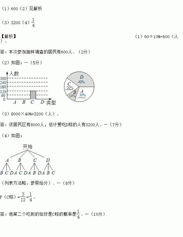 (3)若居民区有8000人,请估计爱吃D粽的人数;