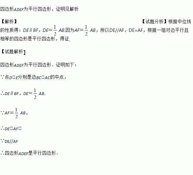 如图,△ABC中,点D,E分别是边BC,AC的中点,连接DE,AD,点F在BA的延长线上,且AF=