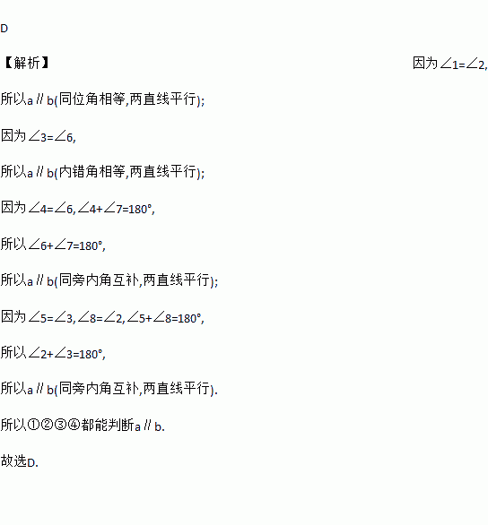 D 【解析】因为∠1=∠2, 所以a∥b(同位角相等,两直线平行); 因为∠3=∠6, 所以a∥b(内错角相等,两直线平行); 因为∠4=∠6,∠4+∠7=180°, 所以∠6+∠7=180°, 所以a∥b(同旁内角互补,两直线平行); 因为∠5=∠3,∠8=∠2,∠5+∠8=180°, 所以∠2+∠3=180°, 所以a∥b(同旁内角互...