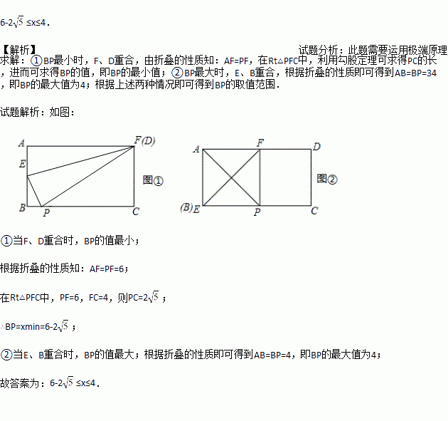 如图,矩形纸片ABCD中,AB=4,AD=6,点P是边BC上的动点,现将纸片折叠,使点A与点P重合,折痕与矩形边的交点分别为E、F,要使折痕始终与边AB、AD有交点,则BP的取值范围是_________________.
