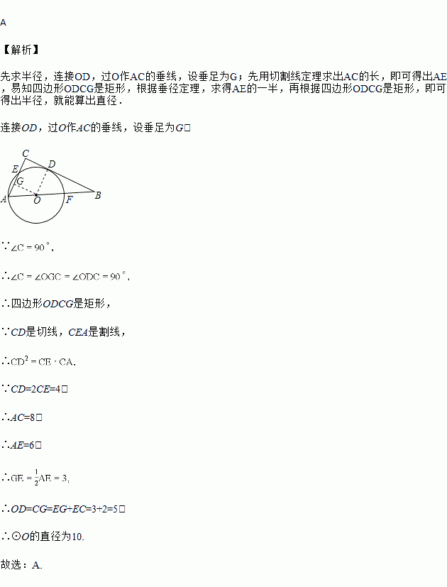 如图,中,,为上一点,以为圆心,为半径作圆与相切于点,分别交、于、,若,则的直径为( )