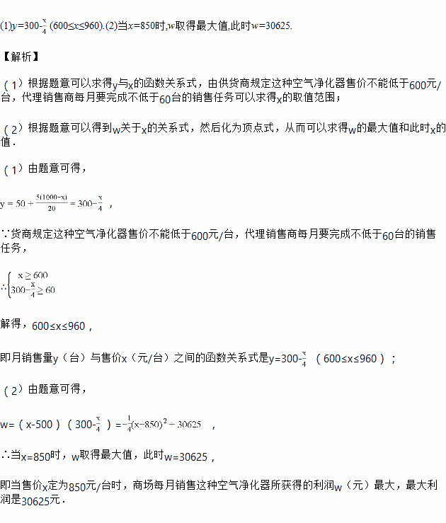 最近雾霾天气频繁,使得空气净化器得以畅销.某商场代理销售某种空气净化器,其进价是500元/台,经过市场销售后发现,当售价是1000元/台时,每月可售出50台,且售价每降低20元,每月就可多售出5台.若供货商规定这种空气净化器售价不能低于600元/台,代理销售商每月要完成不低于60台的销售任务.