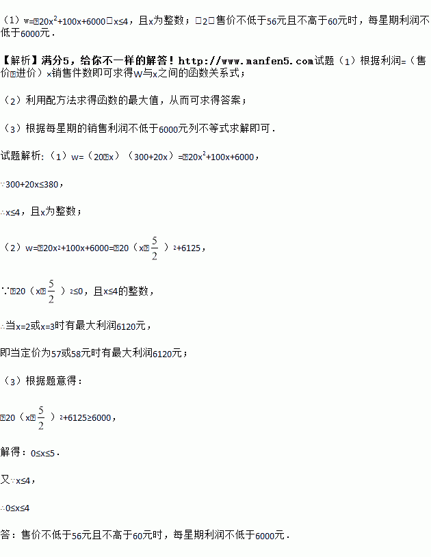 已知某种产品的进价为每件40元,现在的售价为每件60元,每星期可卖出300件.市场调查发现,该产品每降价1元,每星期可多卖出20件,由于供货方的原因销量不得超过380件,设这种产品每件降价x元(x为整数),每星期的销售利润为w元.