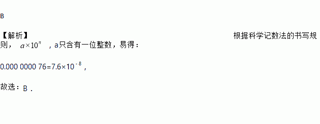 A. 0.76×10﹣7 B. 7.6×10﹣8 C. 7.6×10﹣9 D. 76×10﹣10