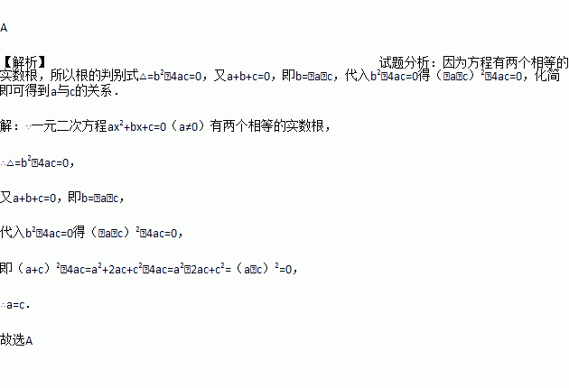 定义:如果一元二次方程ax2+bx+c=0(a≠0)满足a+b+c=0,那么我们称这个方程为“凤凰”方程.已知ax2+bx+c=0(a≠0)是“凤凰”方程,且有两个相等的实数根,则下列结论正确的是( )