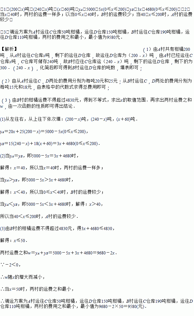 某地A、B两村盛产柑橘,A村有柑橘200吨,B村有柑橘300吨,现将这些柑橘运到C、D两个冷藏仓库.已知C仓库可储存240吨,D仓库可储存260吨,从A村运往C、D两处的费用分别为每吨20元、25元,从B村运往C、D两处的费用分别为每吨15元、18元.设从A村运往C仓库的柑橘重量为x吨,A、B两村运往两仓库的柑橘运输费用分别为yA元、yB元.