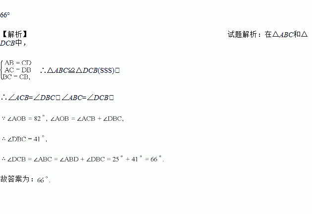 如图,AB=CD,AC=DB,∠ABD=25°,∠AOB=82°,则∠DCB=__________.