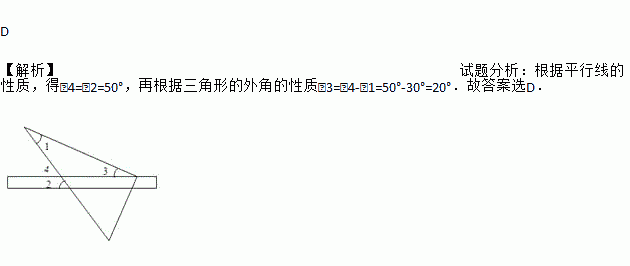 D 【解析】试题分析:根据平行线的性质,得∠4=∠2=50°,再根据三角形的外角的性质∠3=∠4-∠1=50°-30°=20°.故答案选D.