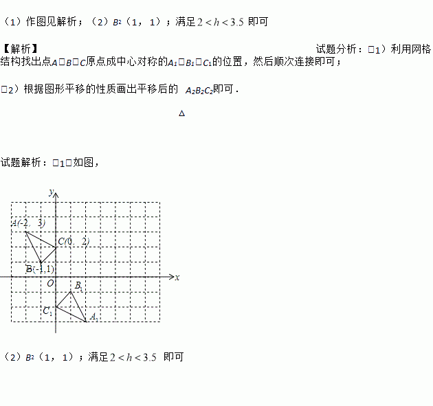 (2)请写出点B关于y轴对称的点B2的坐标 .若将点B2向下平移h单位,使其落在△A1B1C1内部(不包括边界),直接写出h的值 (写出满足的一个即可).
