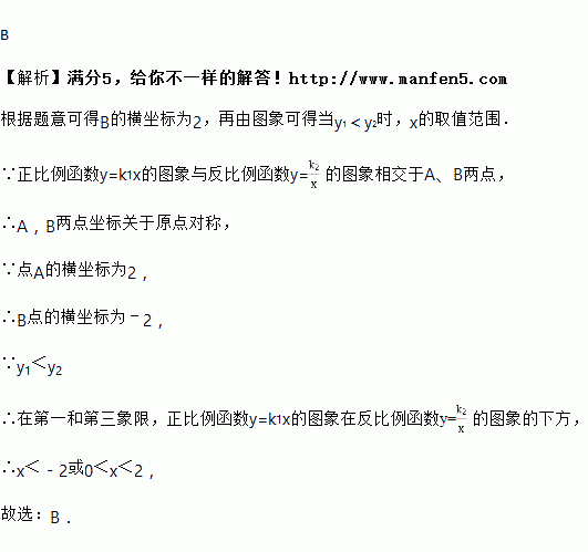 如图,正比例函数y1=k1x的图象与反比例函数y2=