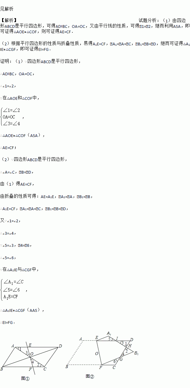 (2)如图2,将?ABCD(纸片)沿过对角线交点O的直线EF折叠,点A落在点A1处,点B落在点B1处,设FB1交CD于点G,A1B1分别交CD、DE于点H、I.求证:EI=FG.