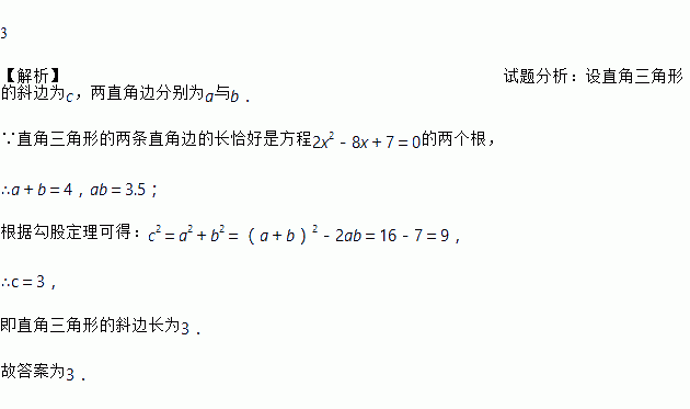 3 【解析】试题分析:设直角三角形的斜边为c,两直角边分别为a与b. ∵直角三角形的两条直角边的长恰好是方程2x2-8x+7=0的两个根, ∴a+b=4,ab=3.5; 根据勾股定理可得:c2=a2+b2=(a+b)2-2ab=16-7=9, ∴c=3, 即直角三角形的斜边长为3. 故答案为3.