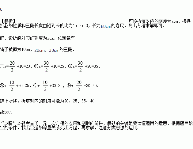 如图,将一段标有0~60均匀刻度的绳子铺平后折叠(绳子无弹性),使绳子自身的一部分重叠,然后在重叠部分沿绳子垂直方向剪断,将绳子分为A、B、C三段,若这三段的长度由短到长的比为1:2:3,则折痕对应的刻度不可能是( )