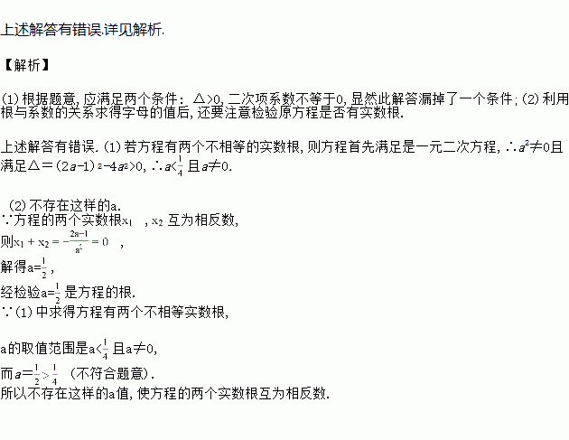 时,方程的两个实数根x1与x2互为相反数.上述解答过程是否有错误?如果有,请指出错误之处,并解答.