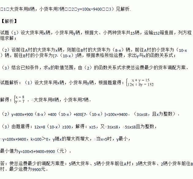 为了贯彻落实市委政府提出的“精准扶贫”精神,某校特制定了一系列帮扶A、B两贫困村的计划,现决定从某地运送152箱鱼苗到A、B两村养殖,若用大小货车共15辆,则恰好能一次性运完这批鱼苗,已知这两种大小货车的载货能力分别为12箱/辆和8箱/辆,其运往A、B两村的运费如表: