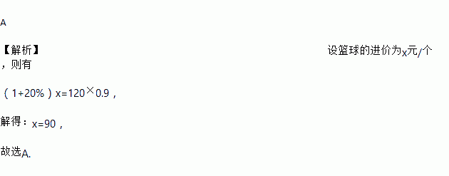 A 【解析】设篮球的进价为x元/个,则有 (1+20%)x=120×0.9, 解得:x=90, 故选A.